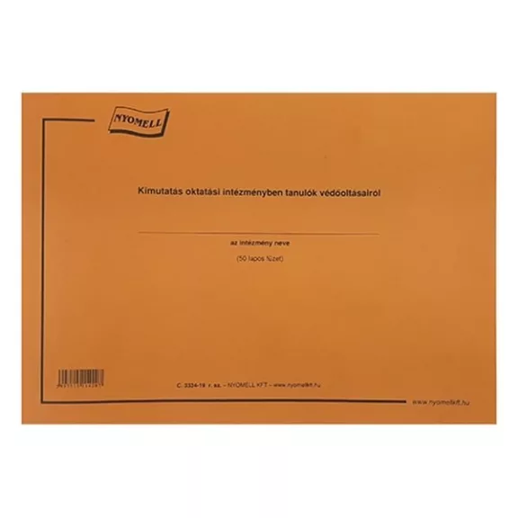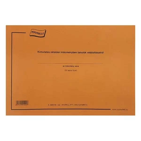 Nyomtatvány kimutatás oktatási intézményben tanulók védőoltásairól. C3334-19/ÚJ A/4 méretű, fekvő, 50 lapos. Minőségi belív, karton fedlap, perforációval.