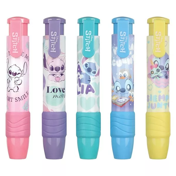Praktikus visszahúzható radír tollszerű kivitelben, aranyos, vidám, mosolygós Stitch mintákkal.