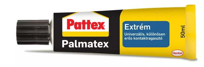 A Pattex Palmatex Extrém a kontakt ragasztók családjának legerősebb tagja! -univerzális, különösen erős kontaktragasztó -felhasználása széleskörű, gyorsan és nagyon erősen ragaszt -akár +120°C-on is alkalmazható, könnyen kenhető, szinte minden felület minden felület ragasztható vele (nem alkalmas PE, PP, habosított polisztirol – Styropor® – és lágy PVC ragasztásához) -vízálló, a ragasztás ellenáll híg savaknak és lúgoknak