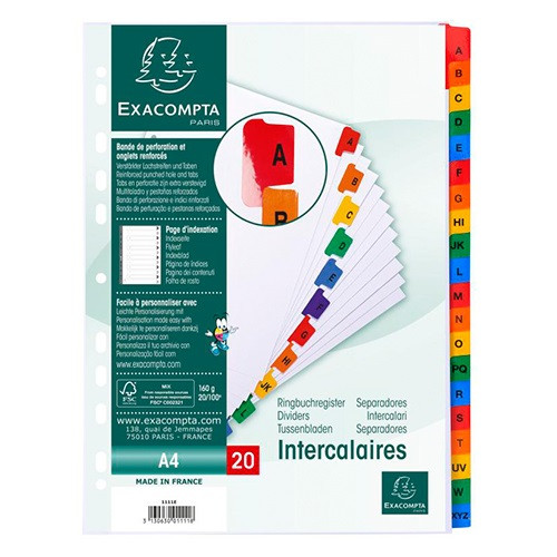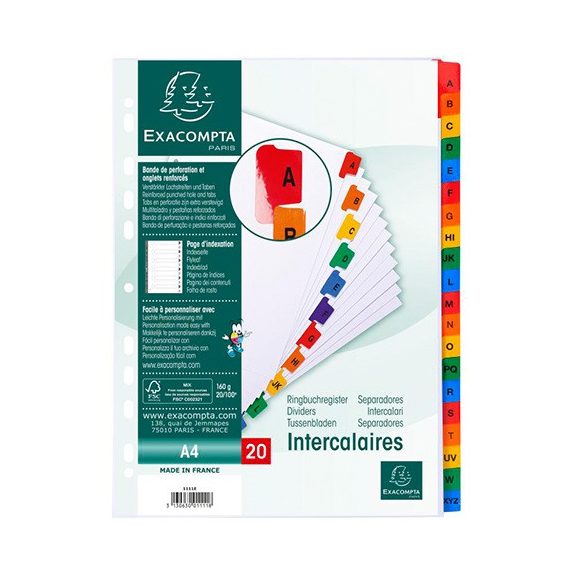 Regiszter karton Exacompta A/4 A-Z 20 részes fehér, színes laminált fülekkel
