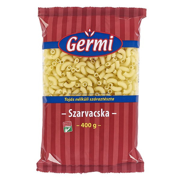 Gyermelyi Germi. Tojás nélküli szarvacska száraztészta. Kiszerelés: 400g./csomag. Allergének: glutén, nyomokban tojást tartalmazhat.