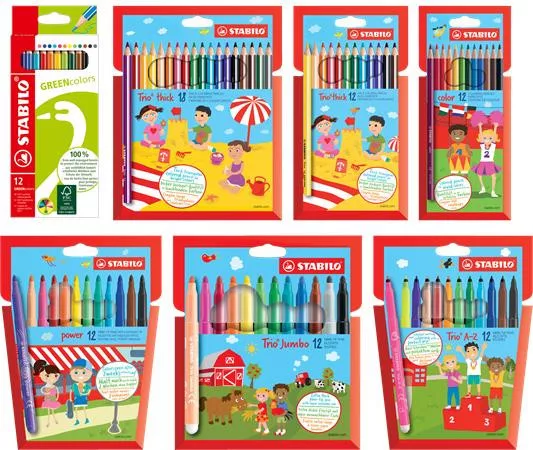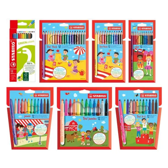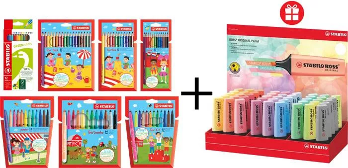A csomag 6-6 készlet tartalmaz az alábbiakból: -TST19127703Színes ceruza készlet, hatszögletű, STABILO "Color", 12 különböző szín -TST20312Színes ceruza készlet, háromszögletű, vastag, STABILO "Trio thick", 12 különböző szín -TST20318Színes ceruza készlet, háromszögletű, vastag, STABILO "Trio thick", 18 különböző szín -TST6019121Színes ceruza készlet, hatszögletű, STABILO "GreenColors", 12 különböző szín -TST28012 Filctoll készlet, 2 mm, STABILO "Power", 12 különböző szín -TST37811203Filctoll készlet, 0,7 mm, STABILO "Trio A-Z", 12 különböző szín -TST38012Filctoll készlet, 3 mm, STABILO "Trio Jumbo", 12 különböző szín Ajándék: TST70454 Szövegkiemelő display, 2-5 mm, STABILO "BOSS Pastel", vegyes pasztell színek Gyártó/első EU forgalmazó elérhetősége: STABILO international GmbH Magyarországi Fióktelepe 1033 Budapest, Szőlőkert köz 7/a. info.hu@stabilo.com www.stabilo.hu