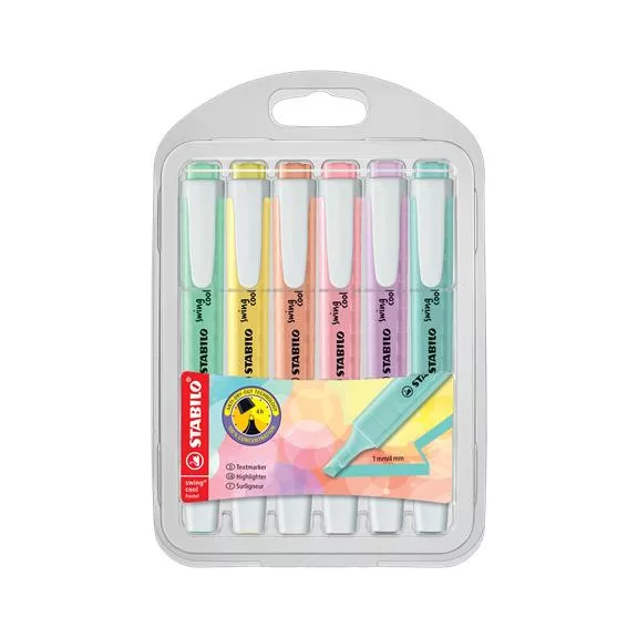 A STABILO swing cool Pastel kollekció ideális választás mindazoknak, akik finom, elegáns kiegészítőkkel szeretnek kitűnni a tömegből - prémium minőségű szövegkiemelők - pasztell színek - vízbázisú tinta - intenzív fedésű színek - vágott hegy (1-4 mm) - a tinta színével megegyező tolltest - íráshossz: 350 m - kiszerelés: 6 darab / csomag