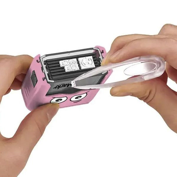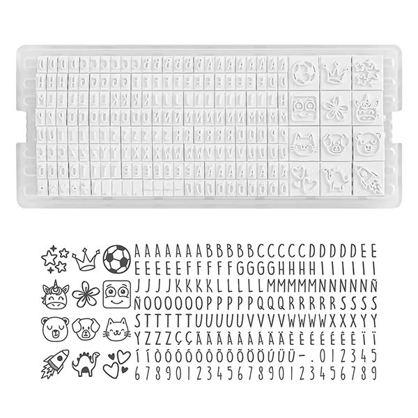 Készlet tartalma: bélyegző karakter készlet (angol abc betűi + 12 piktogram csipesz 1 m vasalható szalag 20 db címke Nyomat méret: 38 x 14 mm. Kirakható sorok száma: 3 (15 karakter/sor) A megjelölt ruhák, tárgyak mosó-, mosogatógépben moshatók.