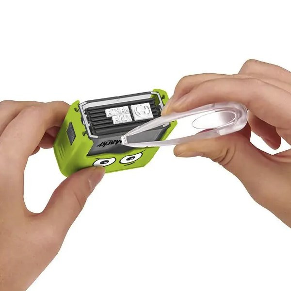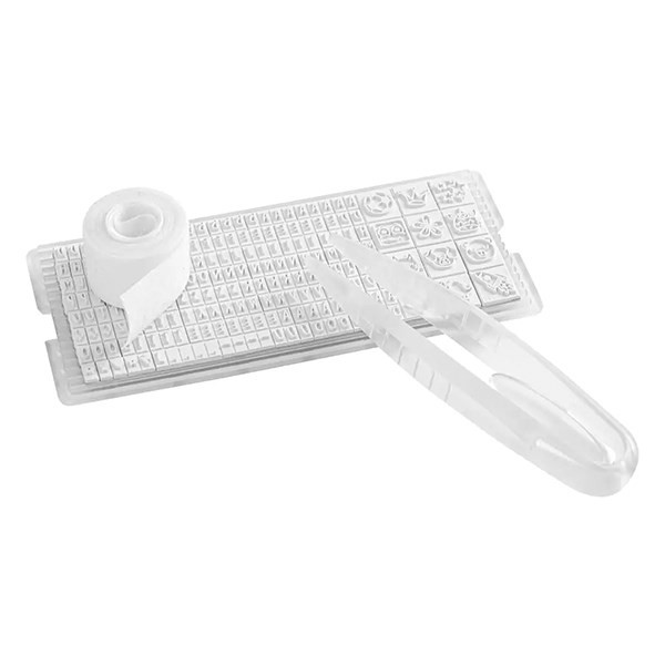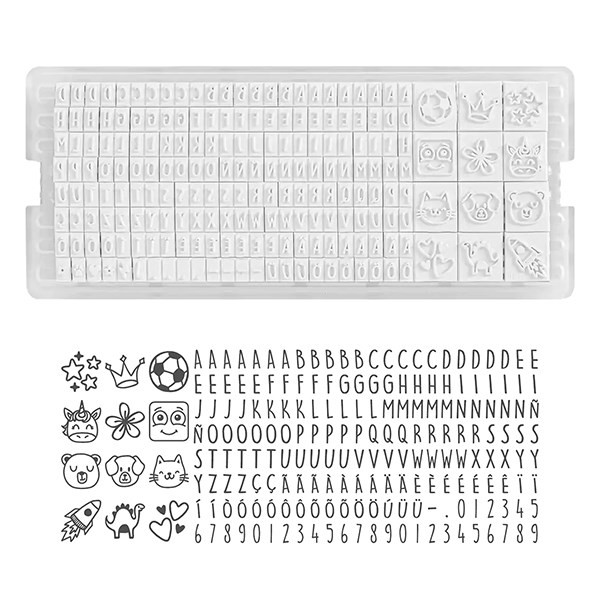 Praktikus, kirakós textil bélyegző a gyermekek ruháinak, tárgyainak megjelölésére. A betűkészletből kirakható a név, piktogramokkal színesítve.