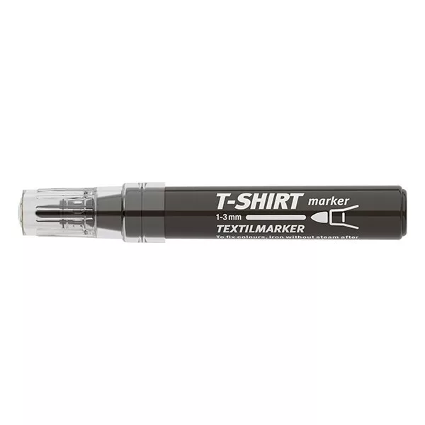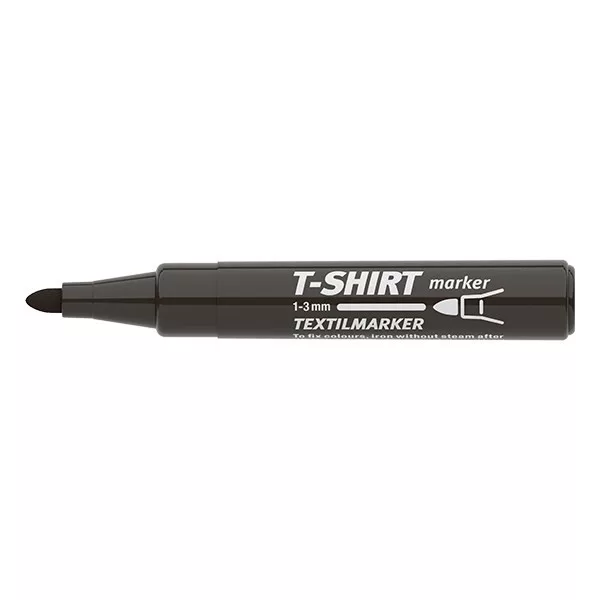 Textilmarker, textiliák pl:selyem,pamut,vászonra.Pl: tornacipő, póló, táska írására,jelőlésére alkalmas.Kerekített csúccsal, vízbázisú festékkel töltve, rendkívüli színtartóssággal és magas fényállósággal.A dekoráció rögzítése gőzmentes bevasalással történik. Rögzítés után 60 °C-ig mosható. Vonalvastagság: 1-3 mm.