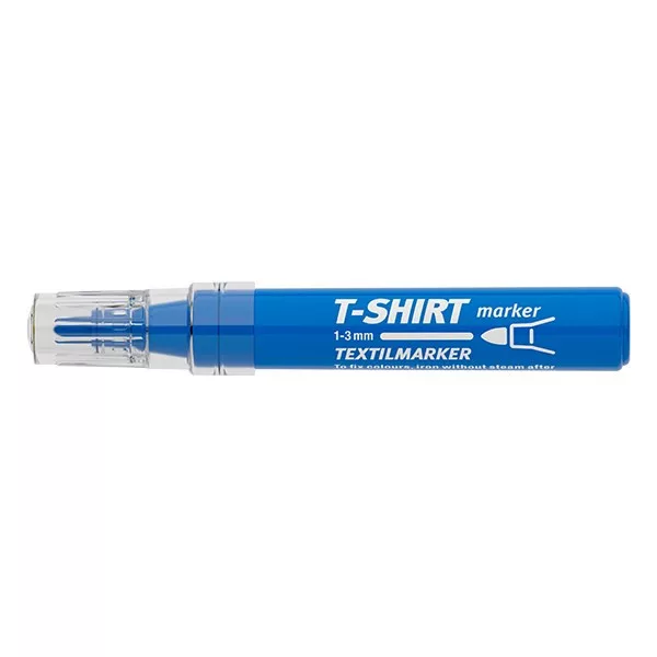 Textilmarker, textiliák pl:selyem,pamut,vászonra.Pl: tornacipő, póló, táska írására,jelőlésére alkalmas.Kerekített csúccsal, vízbázisú festékkel töltve, rendkívüli színtartóssággal és magas fényállósággal.A dekoráció rögzítése gőzmentes bevasalással történik. Rögzítés után 60 °C-ig mosható. Vonalvastagság: 1-3 mm.