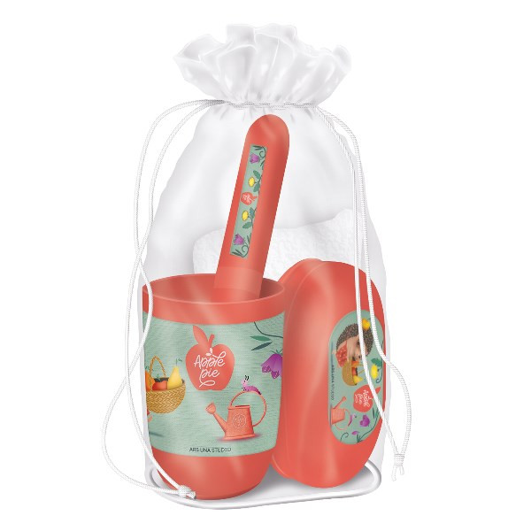 Tisztasági csomag összehúzható, zsinóros átlátszó zsákban. Tartalma: műanyag pohár, szappantartó, fogkefetartó, kéztörlő.