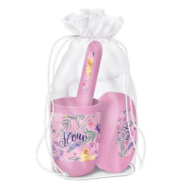 Tisztasági csomag összehúzható, zsinóros átlátszó zsákban. Tartalma: műanyag pohár, szappantartó, fogkefetartó, kéztörlő.