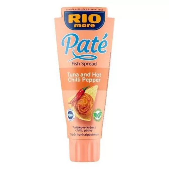 Tonhal pástétom csípős chili paprikával. Rio Mare. Összetevők: Tonhal 44%, víz, paprika, só, kukoricaolaj, rizskeményítő. Allergén: hal és belőle készült termék. Hozzáadott tartósítószert nem tartalmaz. Kiszerelés: 100 g/ tubus.
