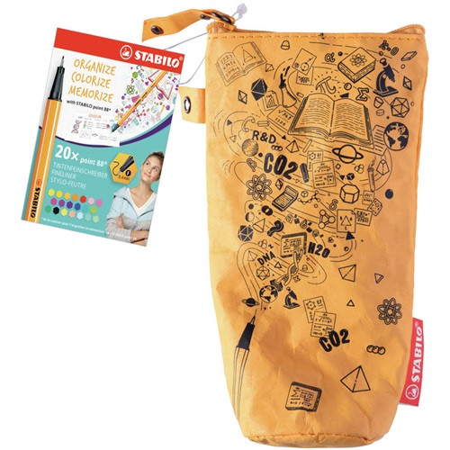 • A csomagolás 80% papírból készült, amely kiszínezhető, és praktikus, cipzáras tolltartóként használható.