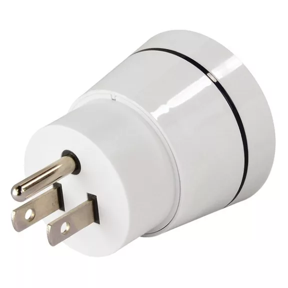Kompakt utazási dugó Európából utazóknak- Fehér dizájnos ház kék LED-es kijelzővel- Dugó (15 A/250V) használható Bahamákon, Barbadoson, Bermudán, Brazíliában, Kanadában, Kolumbiában, Costa Ricán, Kubában, Dominikai Köztársaságban, Haitin, Jamaicában, Japánban, Mexikóban, Fülöp-szigeteken, Szaúd-Arábiában, Tahitin, Tajvanon, USA-ban, Venezuelában