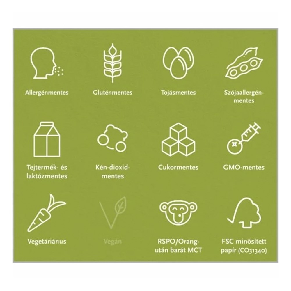 MCT-olaj (RSPO minősítésű pálma- és kókuszolajból), kolekalciferol (D3-vitamin), természetes antioxidáns: E-vitamin (kevert tokoferolokból).