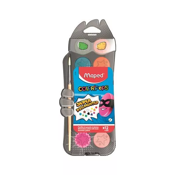 kiváló minőségű vízfesték különböző mennyiségű víz hozzáadásával többféle hatás érhető el a doboz 12 féle színt és egy ecsetet tartalmaz korongok átmérője: 30 mm praktikus méretű, bliszteres kiszerelése miatt könnyen tárolható