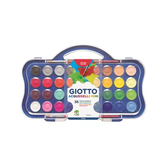 36 színű vízfesték. Műanyag tok. 23 mm átmérőjű tempera pasztillák. Élénk, gazdag színvilág. Magas fedőképesség. A készlet minőségi műszőr ecsettel és festőpalettával ellátva. Könnyen lemosható.