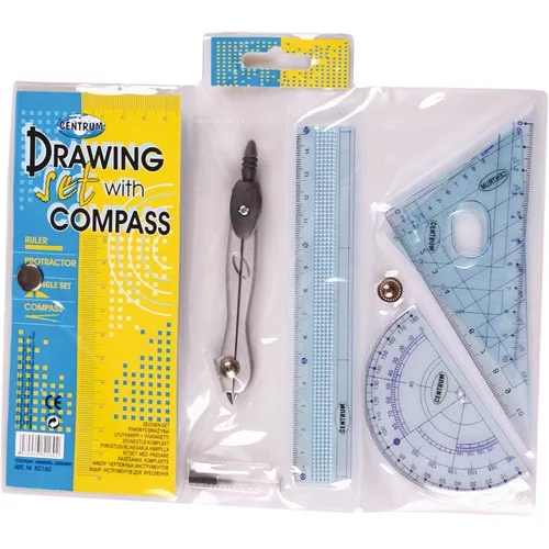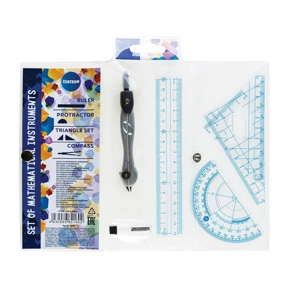 * tartalma: 2 db háromszög vonalzó, 15 cm-es egyenes vonalzó, szögmérő, körző, póthegy