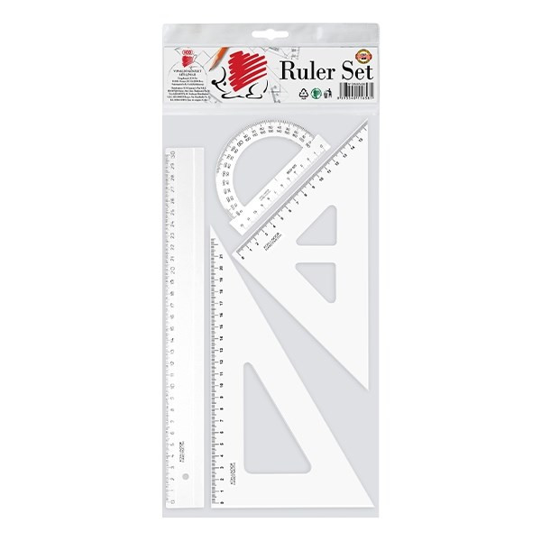 Átlátszó, műanyag vonalzó készlet: 30 cm egyenes-, 45°-os és 60°-os háromszög vonalzó, 180°-os szögmérő.