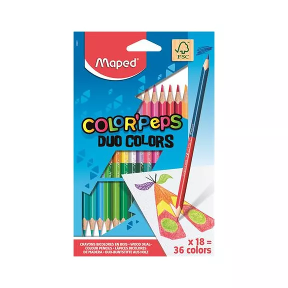 kétvégű színes ceruza 2,9 mm-es, puha és törésbiztos hegy kitűnő fedőképesség élénk színek háromszögalakú ceruzatest a kényelmesebb használat érdekében 18 ceruza / 36 szín arany és ezüst színeket tartalmaz Gyártó/első EU forgalmazó elérhetősége: MAPED SAS 530 route de Pringy - 74370 Argonay sophie.souillard@maped.fr www.maped.com