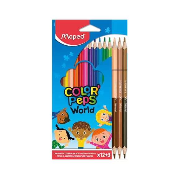 Színes ceruza készlet, háromszögletű, MAPED "Color'Peps World", 12 különböző szín + 3 kétvégű bőrtónus ceruza