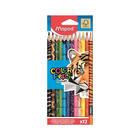 Színes ceruza készlet, háromszögletű, MAPED "Color'Peps Animal", 12 különböző szín