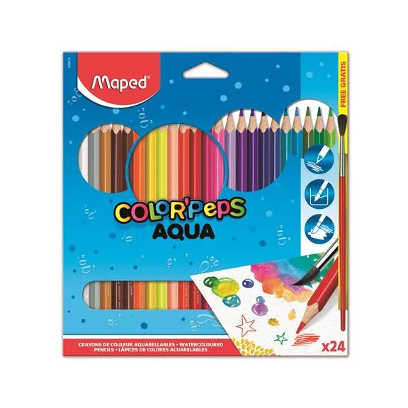 Akvarell ceruza készlet, háromszögletű, ecsettel, MAPED "Color`Peps", 24 különböző szín