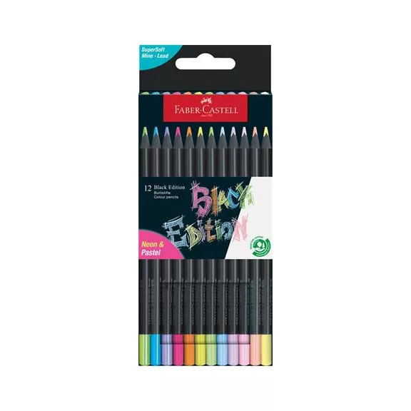 Színes ceruza készlet, háromszögletű, FABER-CASTELL "Black Edition", 6-6 különböző neon és pasztell szín