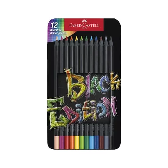 Színes ceruza készlet, háromszögletű, fémdobozban, FABER-CASTELL "Black Edition", 12 különböző szín