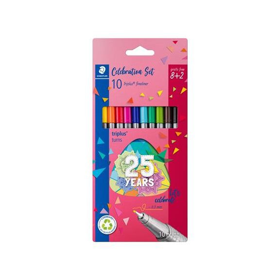 Ünnepeljük együtt a Triplus márka fennállásának 25. születésnapját vidám és színes megjelenésű ünnepi készletekkel! - szupervékony, fémfoglalatú hegy - ergonomikus háromszög kialakítású tolltest a könnyű és kényelmes írásért és színezésért - stabil, nyomásálló hegy - "Dry Safe": napokig nem szárad ki kupak nélkül (kivéve a neon színek) - vízbázisú tinta - a legtöbb textíliából könnyen kimosható - PP tolltest a hosszú élettartamért - vonalvastagság: 0,3 mm - Mix & Match funkció: kombinálható a 323-as modellel - a készlet 10 különböző színt tartalmaz Gyártó/első EU forgalmazó elérhetősége: STAEDTLER SE Moosäckerstr. 3, 90427 Nuremberg, Germany https://www.staedtler.com/intl/en/service/contact/ http://www.staedtler.com