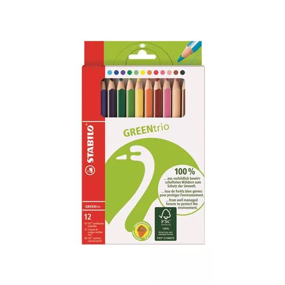 Színes ceruza készlet, háromszögletű, vastag, STABILO "GreenTrio", 12 különböző szín