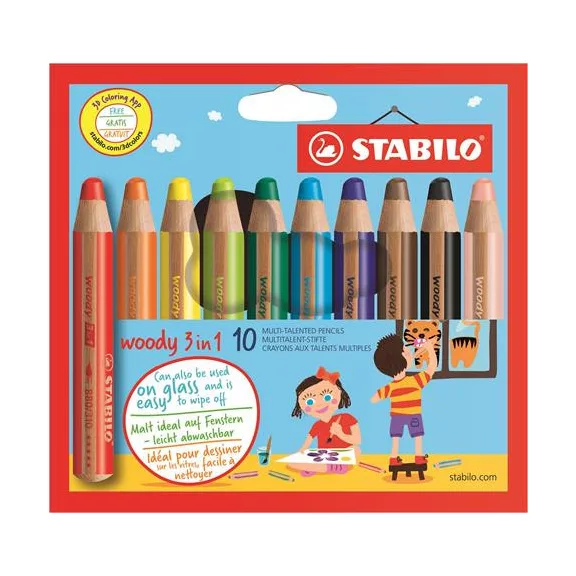 Színes ceruza készlet, kerek, vastag, STABILO "Woody 3 in 1", 10 különböző szín