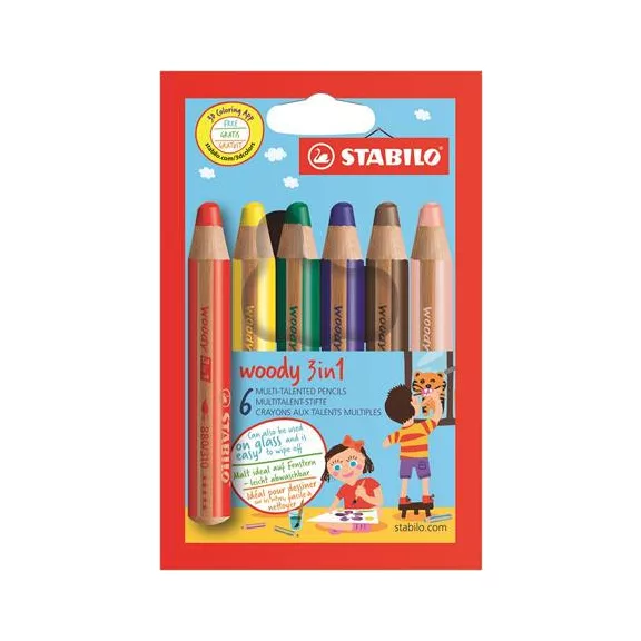 Színes ceruza készlet, kerek, vastag, STABILO "Woody 3 in 1", 6 különböző szín