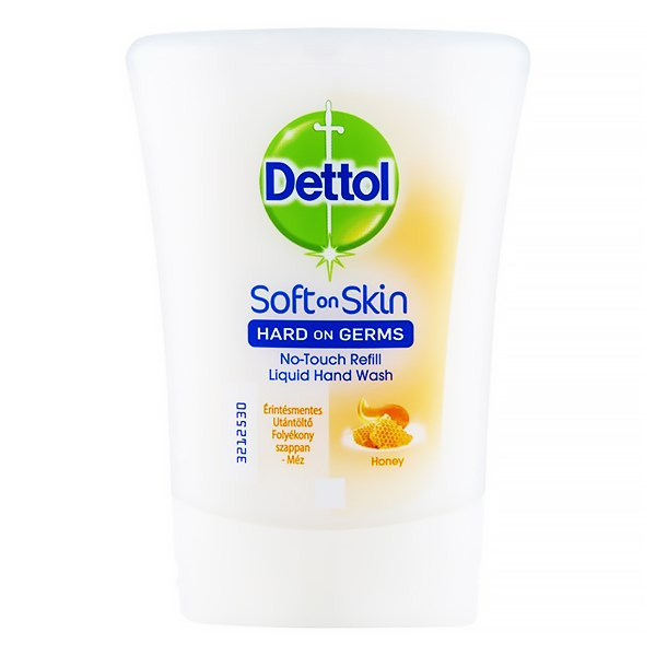 Mézes és vaníliás antibakteriális kézmosó utántöltő a Dettol érintés nélküli készülékhez elpusztítja a baktériumok 99.99 százalékát.