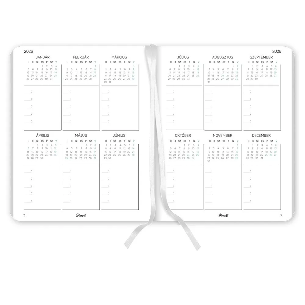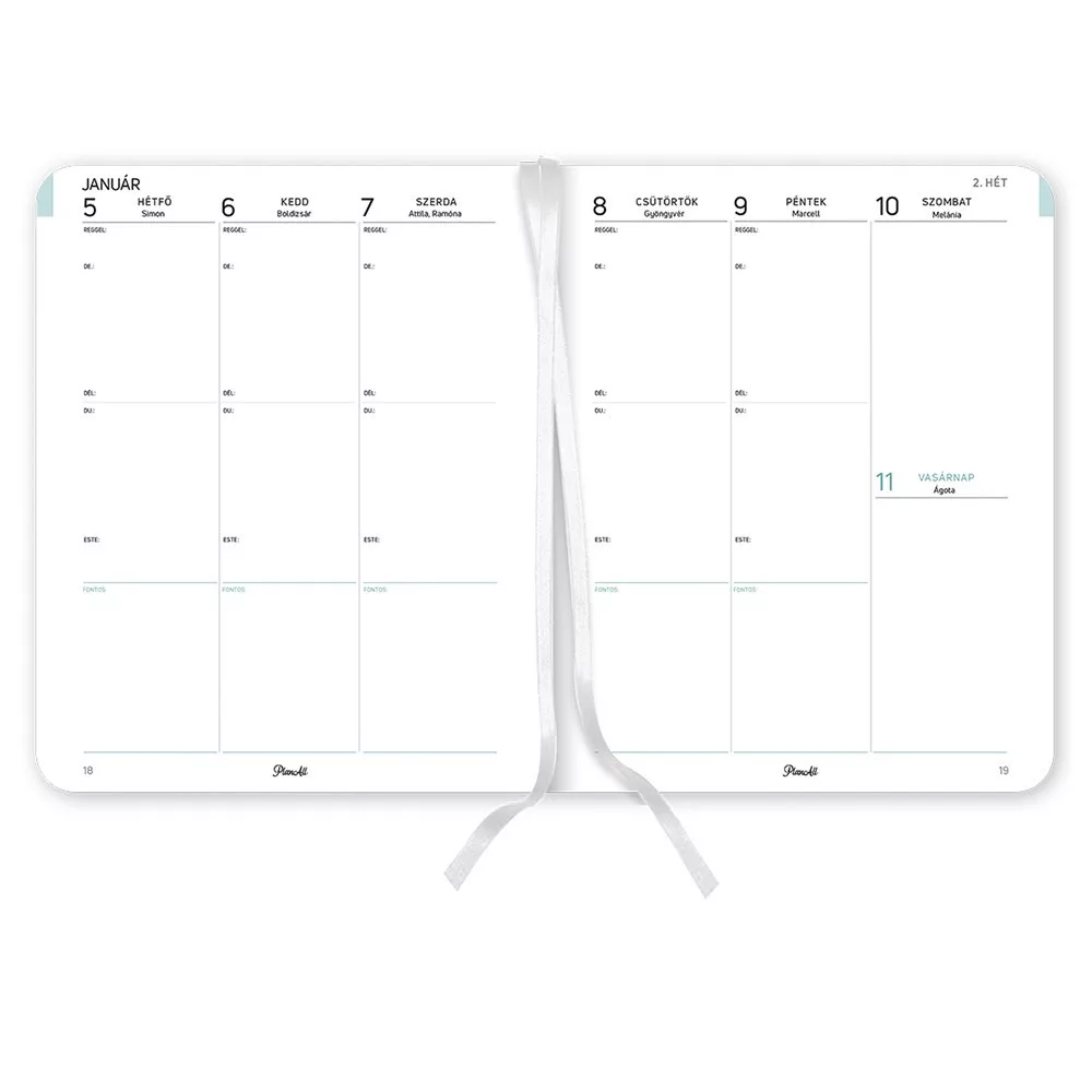 B5 méretű, könyvkötött, keményfedeles, gumi rögzítős heti tervezőnaptár.